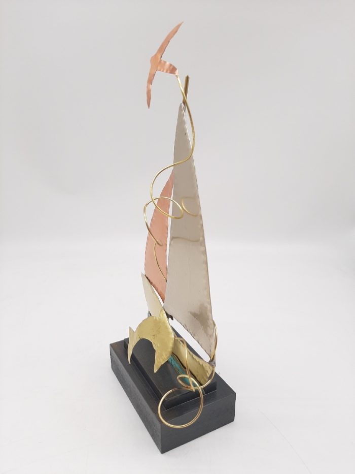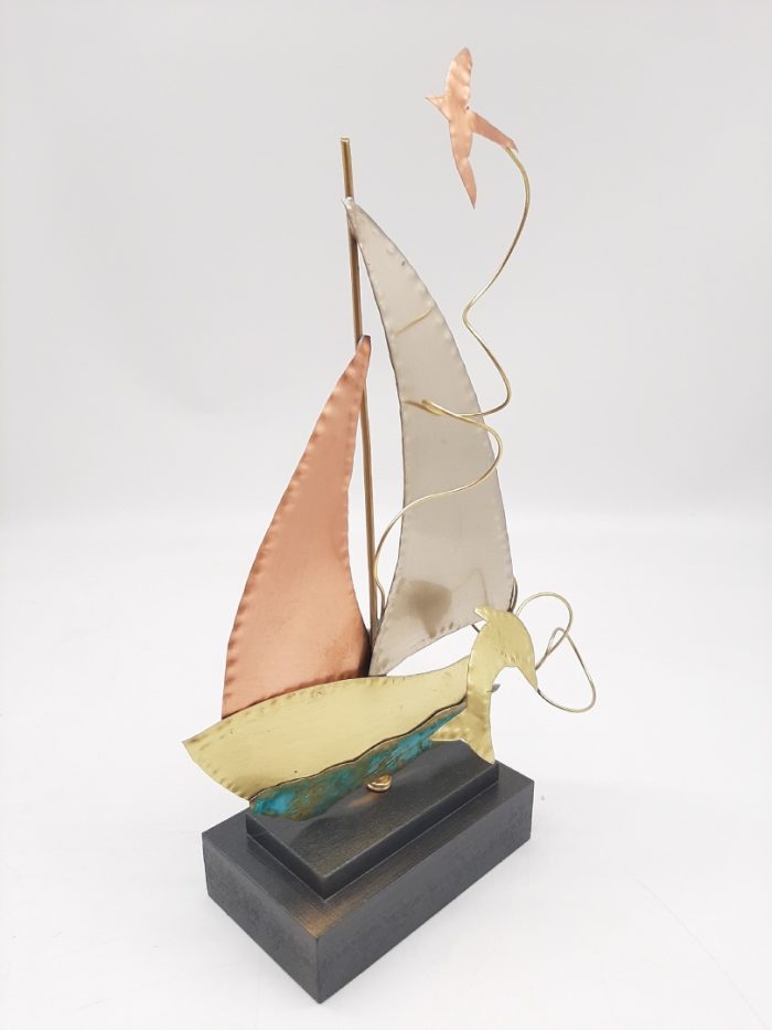 Metalic boat made by brass, cooper and alpaca sheets, on a dark color wooden base.