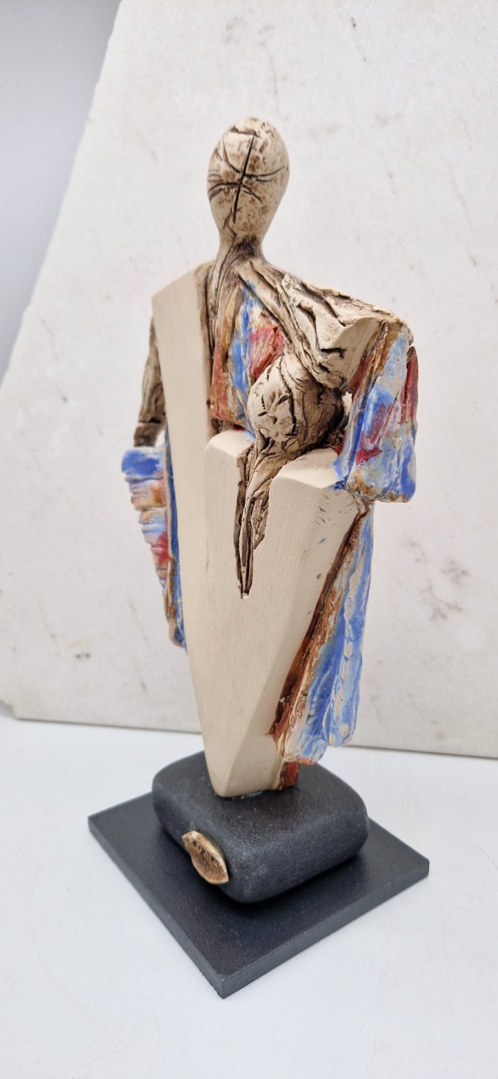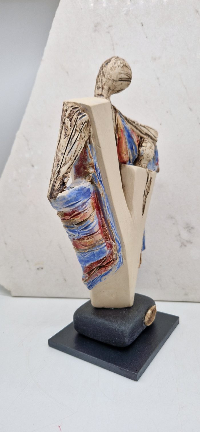 Ceramic sculpture with a colorful pattern, inspired by a female figure lovingly embracing her beloved person.