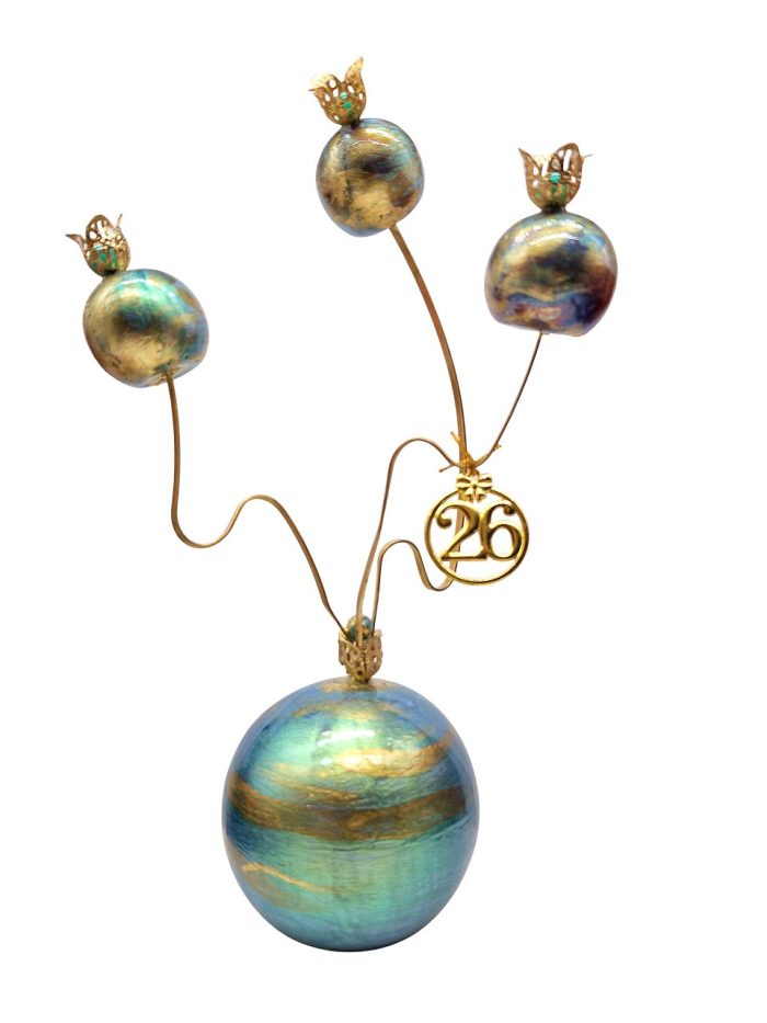 Four porcelain spheres handpainted in lightblue color, decorated with metal elements in a way that makes them look like pomegranates , metalic 2026, tide together with brass wire.