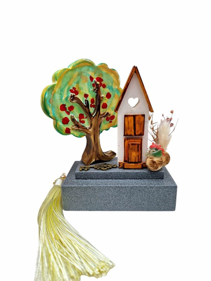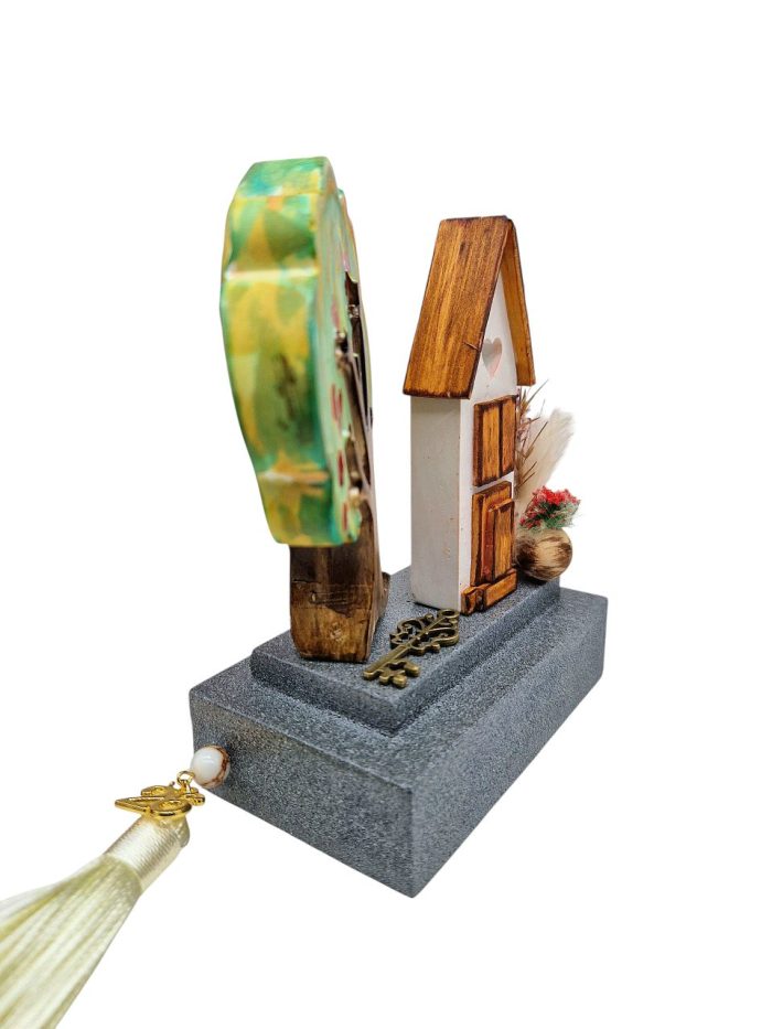 Composition with handpainted porcelain house, decorated with wooden details ( door, window, roof ), dried flowers and handpainted porcelain tree of life, on a wooden base. Rayon tassel metalic 2026 and metalic key, to wish a happiness and lucky house.