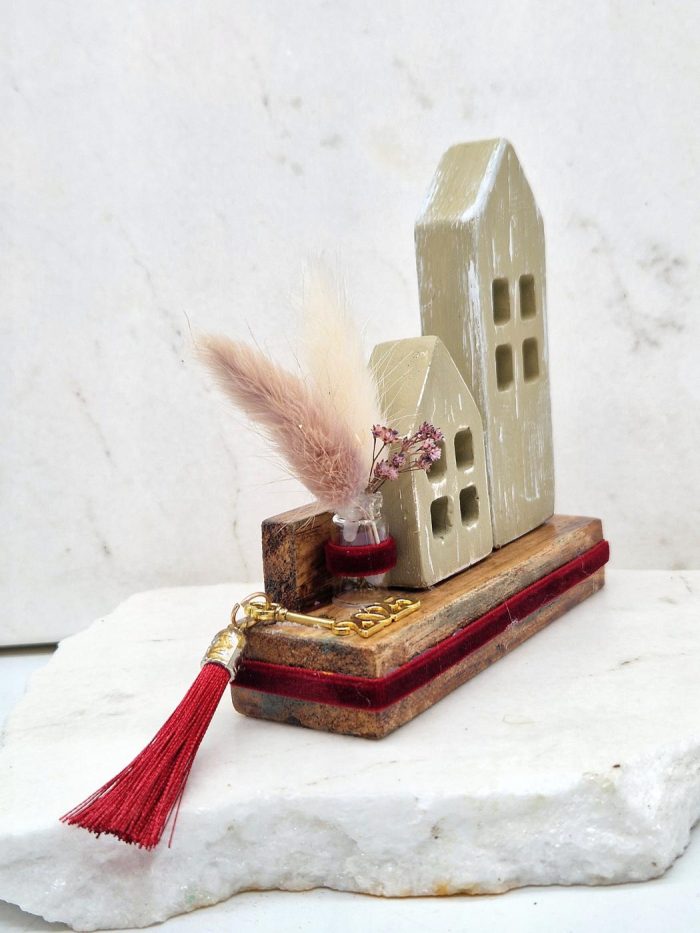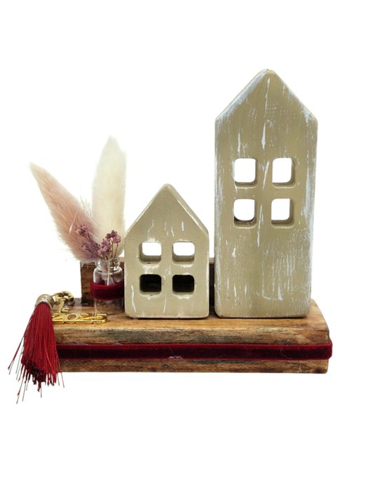 Two porcelain houses on a natural wooden base. Decorated with dried flowers, metalic key and 2025, to wish a happy new year to your friends and partners.