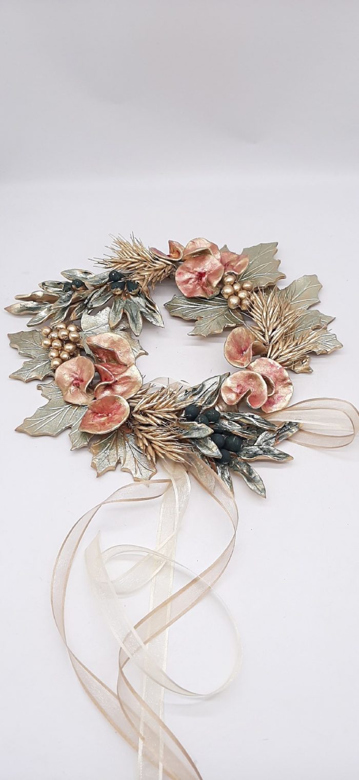 HANDMADE CORN, OLIVE, VINES CLAY WREATHS TIDE ON A BRASS WIRE, IN THREE SIZES.
