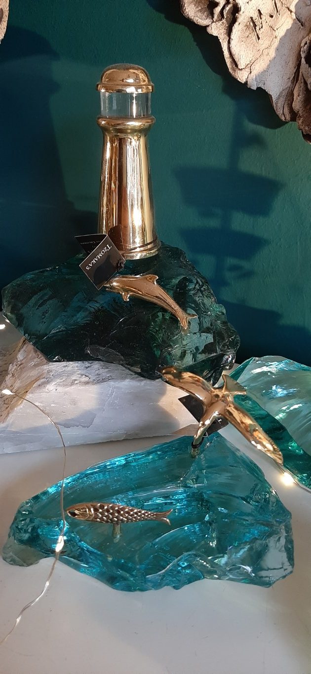 Brass lighthouse and dolphin, coated with special varnish to never lose its shine, on transparent green glass.