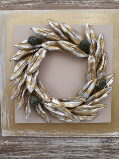 Χειροποίητος πίνακας με κεραμικό στεφάνι ελιάς σε χρώματα ασημί, χρυσό ,πράσινο, πάνω σε τριπλό, ξύλινο, πατιναρισμένο ταμπλό χρώματος καφέ και χρυσό.
