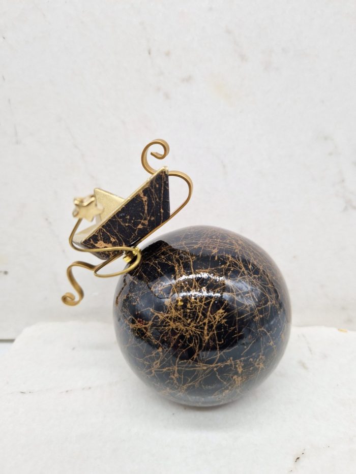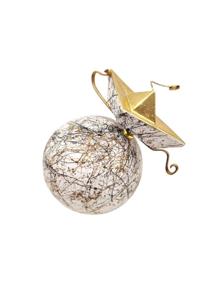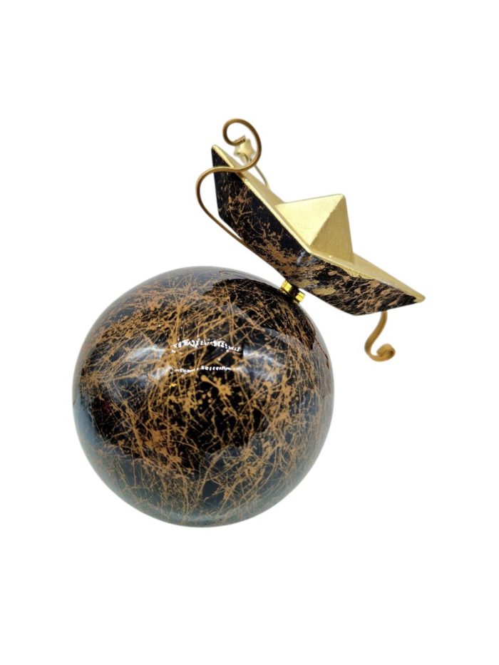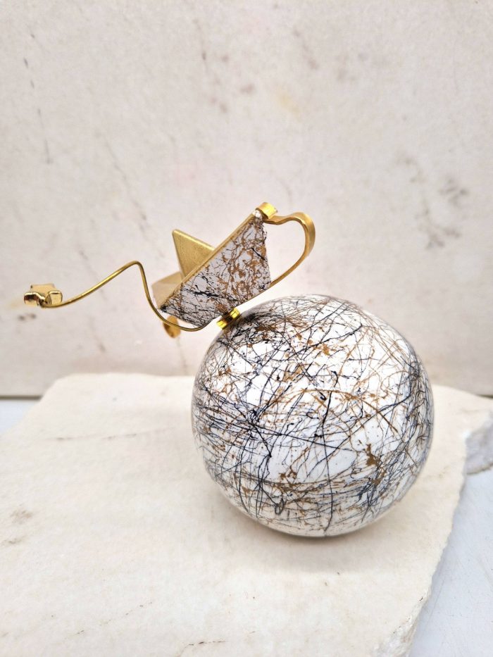 Composition by small, porcelain boat on a porcelain sphere handpainted in the same technique. The composition is tide and decorated with brass wires and metalic star.