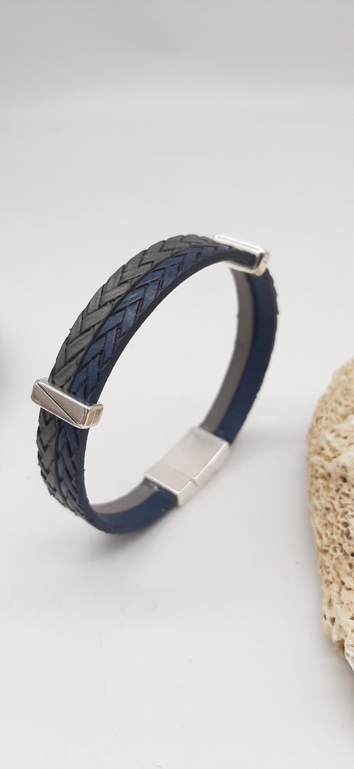 Bracelet made of double blue and gray color synthetic leather, silver-plated metal elements and silver-plated strong magnetic clasp.