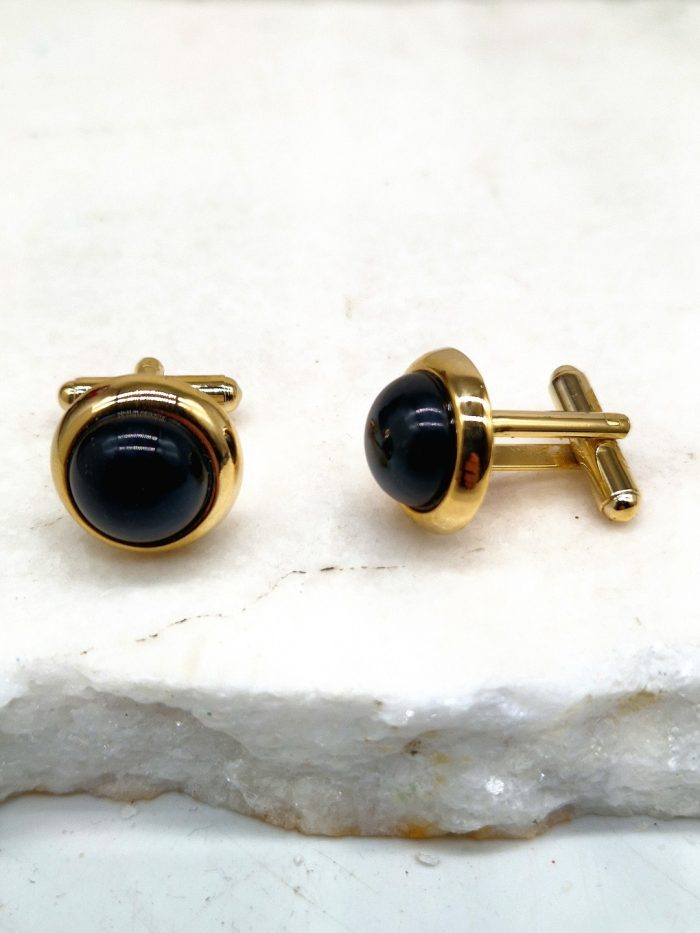 Μανικετόκουμπα στρογγυλά, μεταλλικά, με επιχρύσωση 24Κ και γυάλινη μαύρη πέτρα στο εσωτερικό τους