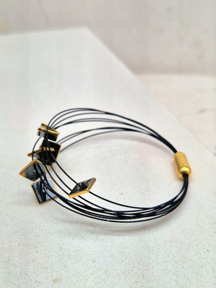 Bracelet by square hematites tide together with black fish line. Magnetic clasp.