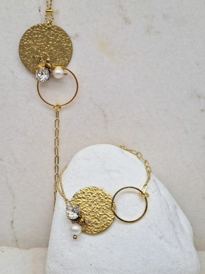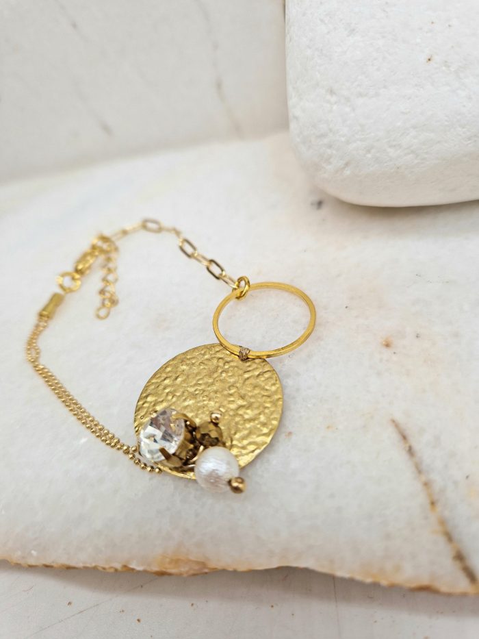 Bracelet with golden color brass disc, bronze and stainless steel chain and crystals stones