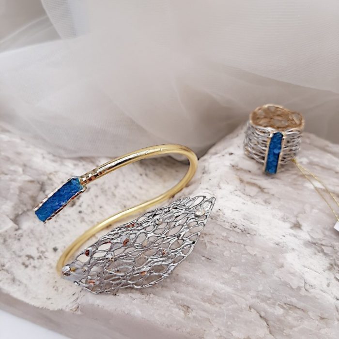 BRASS RING LIKE NET IN SILVER COLOR, TIDE WITH BLUE COLOR MINERALS CRYSTALS