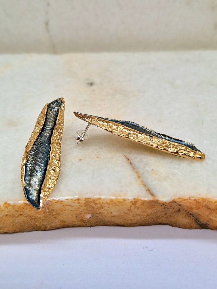 BLACK AND GOLDEN COLORED BRASS EARRINGS, ATTACHED ON EAR WITH STERLING SILVER PINNING