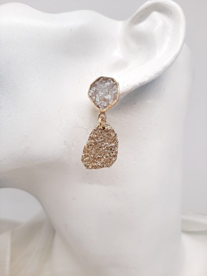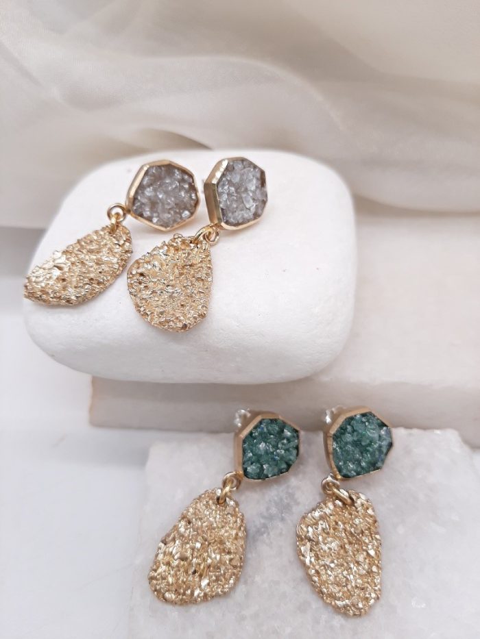 BRASS EARRINGS WITH SILVER PINNING ATTACHED ΟΝ EAR AND WHITE OR GREEN- BLUE COLORS CRYSTALS