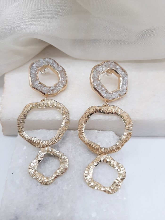 BRASS HOOPS EARRINGS WITH SILVER PINNING ATTACHED ΟΝ EAR & WHITE COLOR CRYSTALS