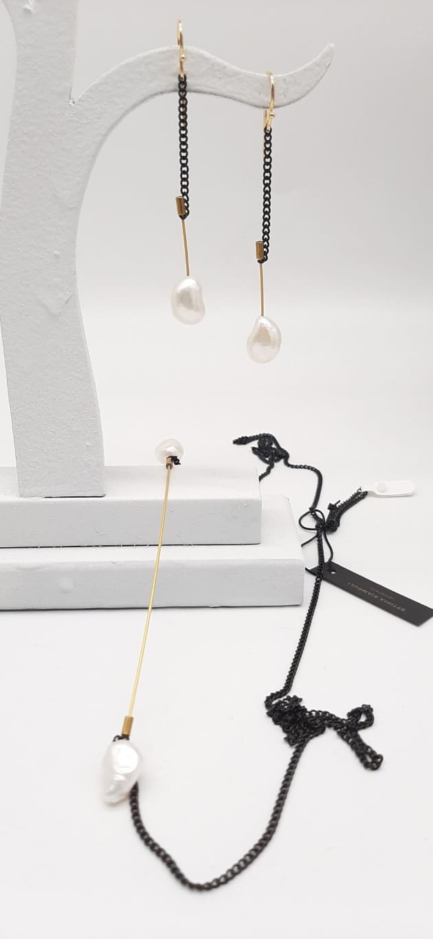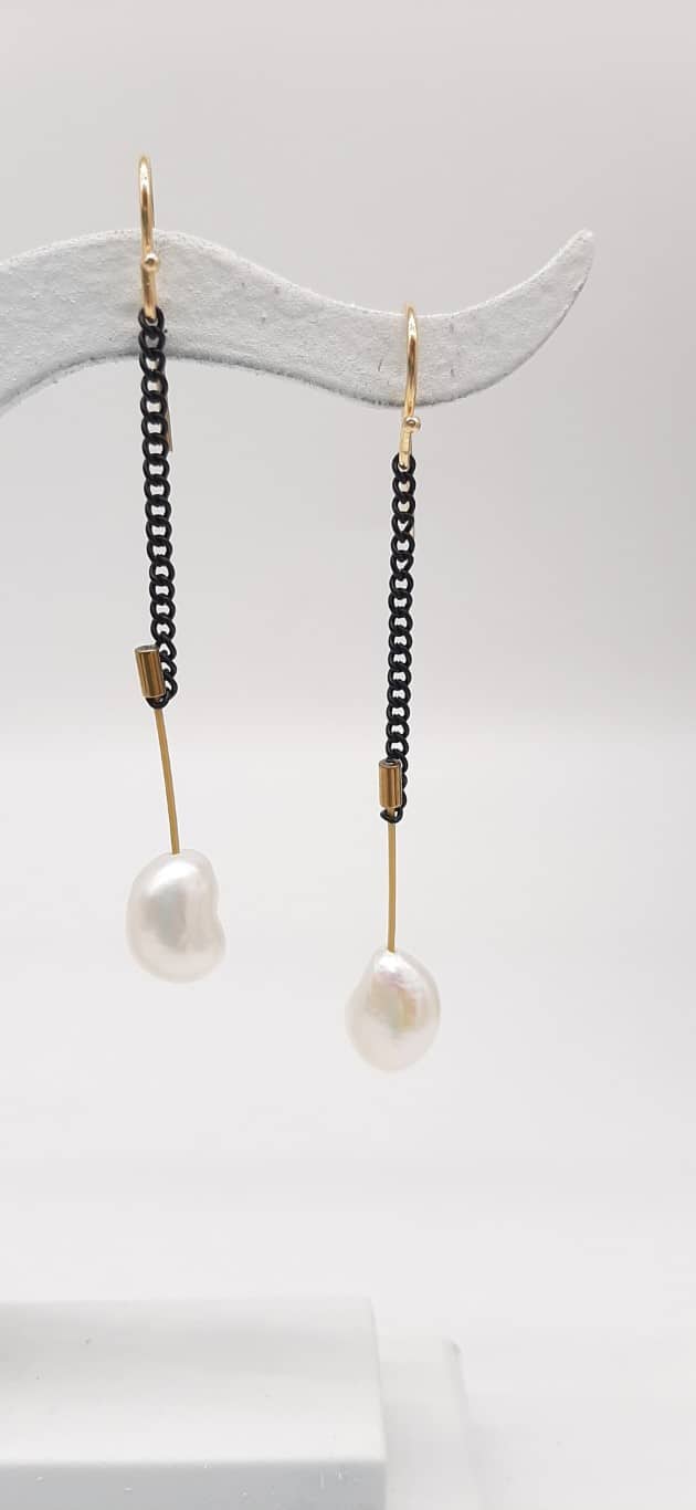 Earrings with black steel chain , and fresh water pearl. Hand made greek creation from Eftihia Siamouli.