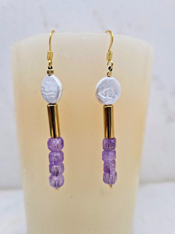 EARRINGS WITH AMETHYST STONES, GOLDEN HEMATITE, FRESHWATER PEARL AND GOLD PLATED SILVER HOOK