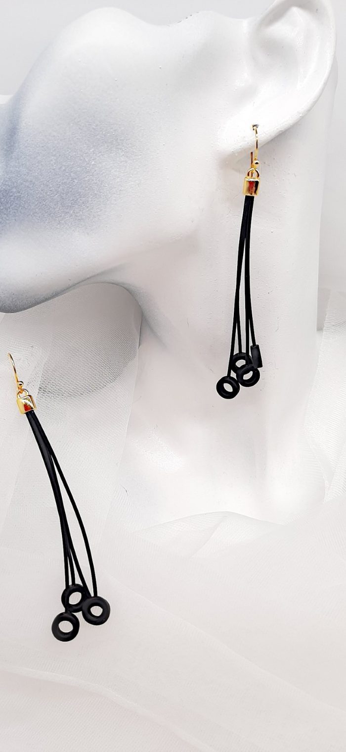 Handmade earrings with golden or black hematites, thin black silk cord and sterling silver covered by gold hook.