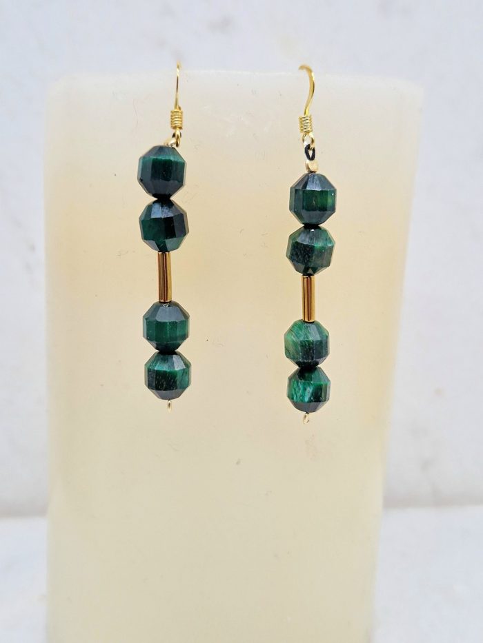 EARRINGS WITH GREEN SEMIPRECIOUS STONES (CAT EYE’S ), GOLD HEMATITES AND GOLD PLATED SILVER HOOK