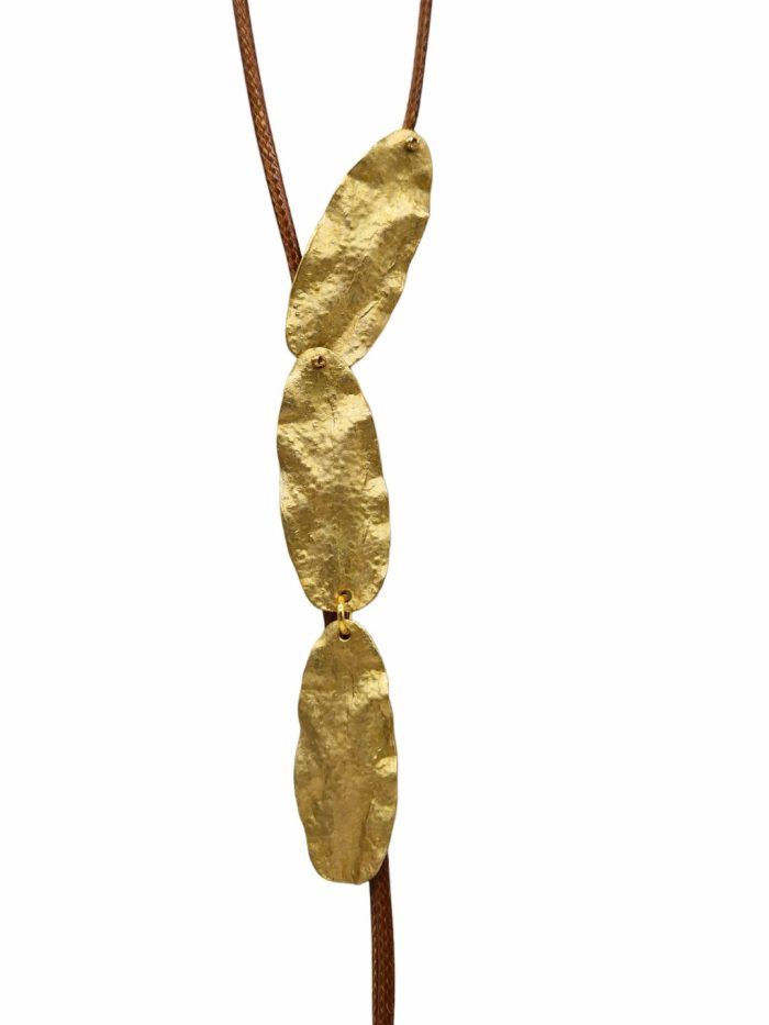 Brass necklace with three golden color motifs and hight quality brown cord.