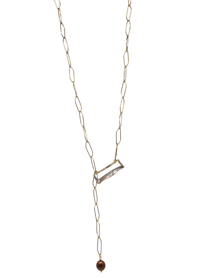 Long brass necklace with brass motif colored inside like pearl, tide with sterling steel chain and a brown fresh water pearl.