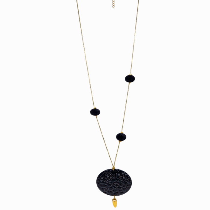 Handmade necklace with forged brass black disc and black velvet beads, tide together with golden bronze chain.