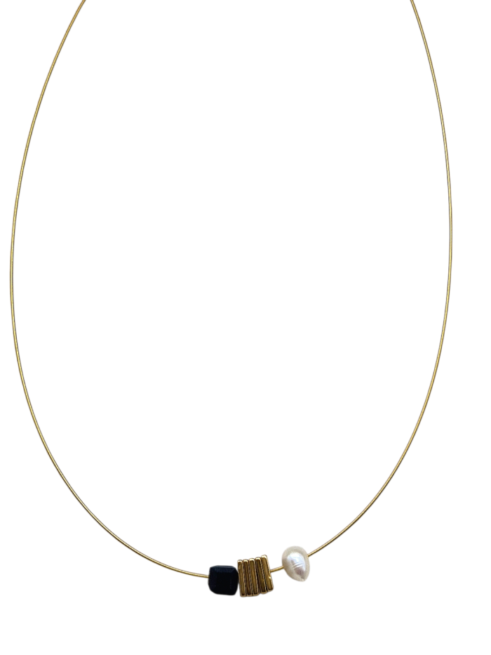 Short necklace by square black onyx, square hematites and fresh water pearl tide together with golden steel wire.