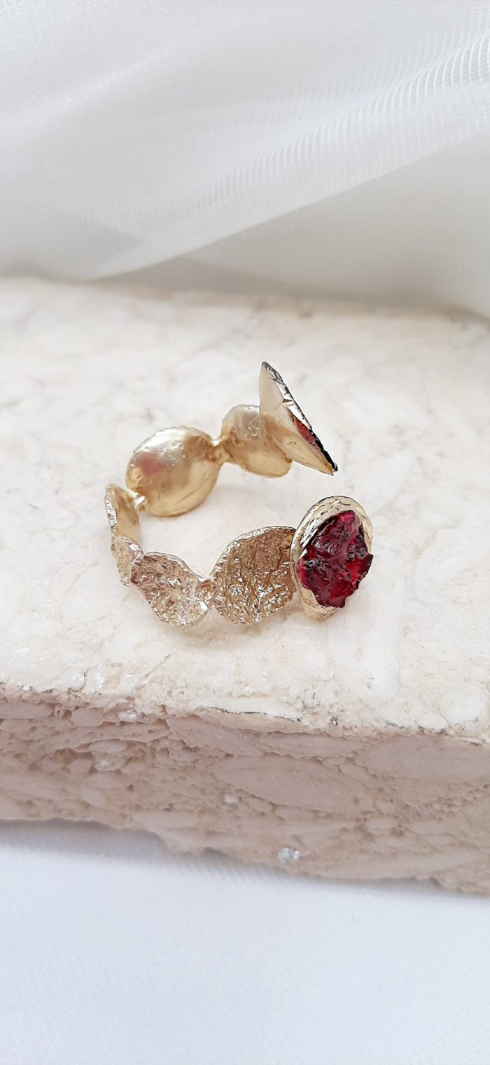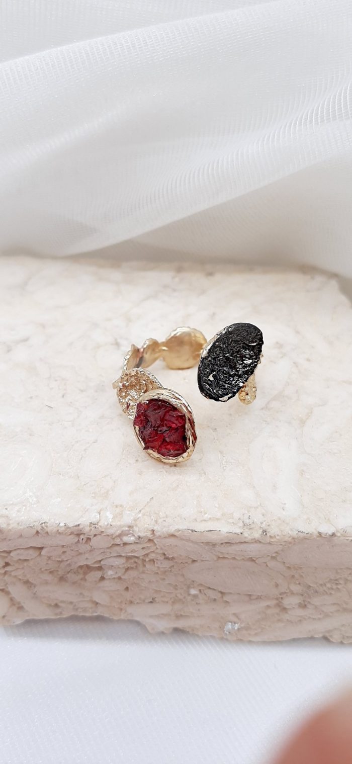 Golden and black brass ring and red crystals. Possible to order the crystals in different color after contact with our shop.
