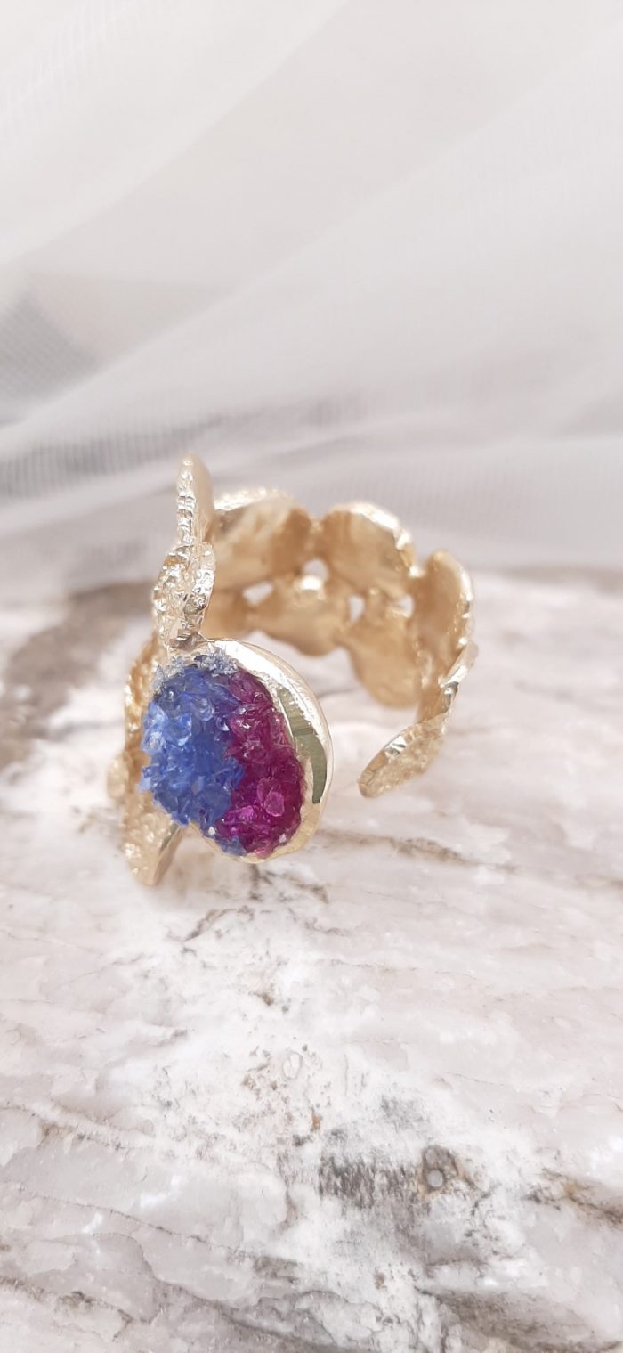 Golden brass ring with blue and purple crystals.