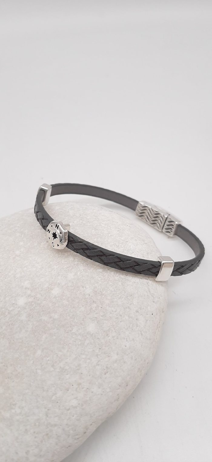 Βραχιόλι από συνθετικό δέρμα σε γκρι χρώμα με επάργυρα μεταλλικά στοιχεία και επάργυρο μεταλλικό κούμπωμα με ισχυρό μαγνήτη.