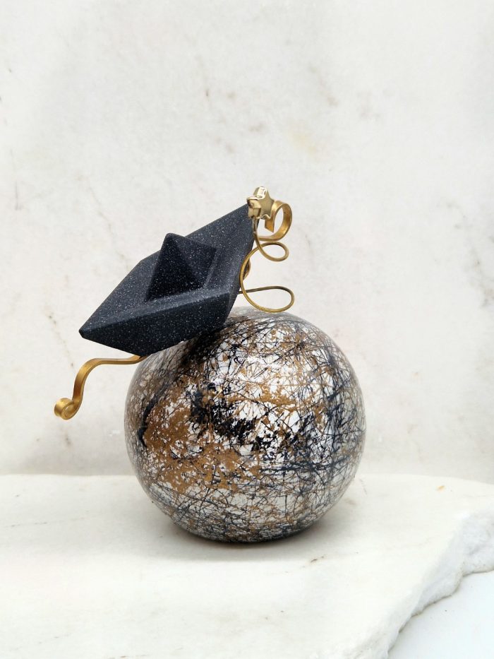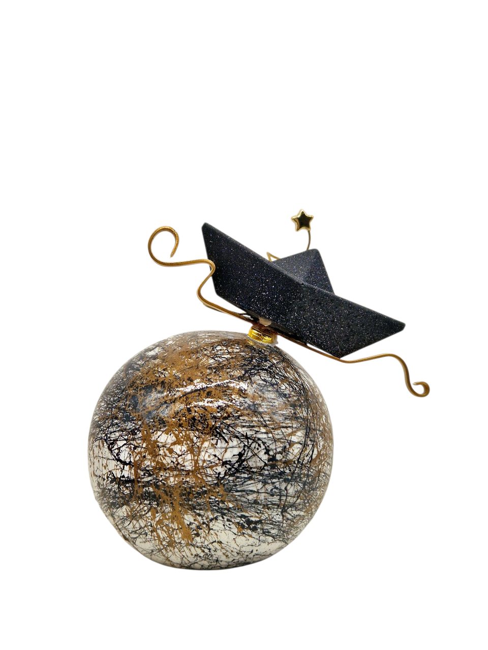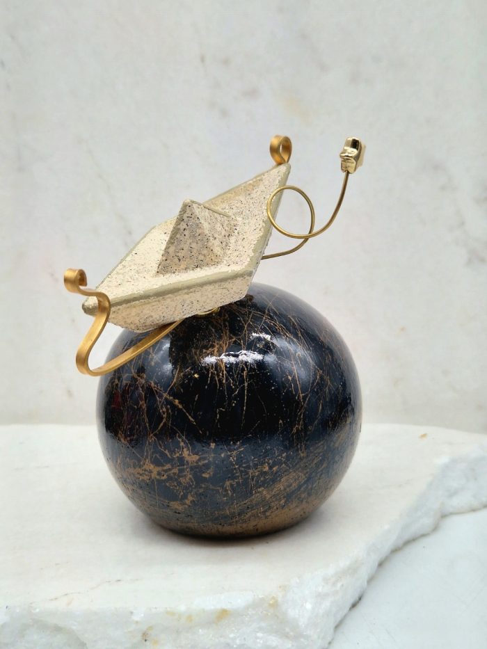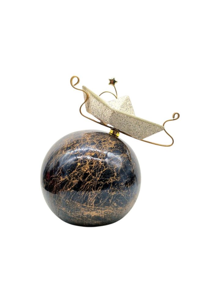 Ζωγραφισμένη σφαίρα από πορσελάνη πάνω στην οποία κάθεται μικρό πορσελάνινο “χάρτινο” καραβάκι, ζωγραφισμένο τεχνοτροπία σαν γρανίτης. Η σύνθεση είναι δεμένη και διακοσμημένη με ορειχάλκινα σύρματα που δίνουν την αίσθηση του κύματος και μεταλλικό αστέρι.
