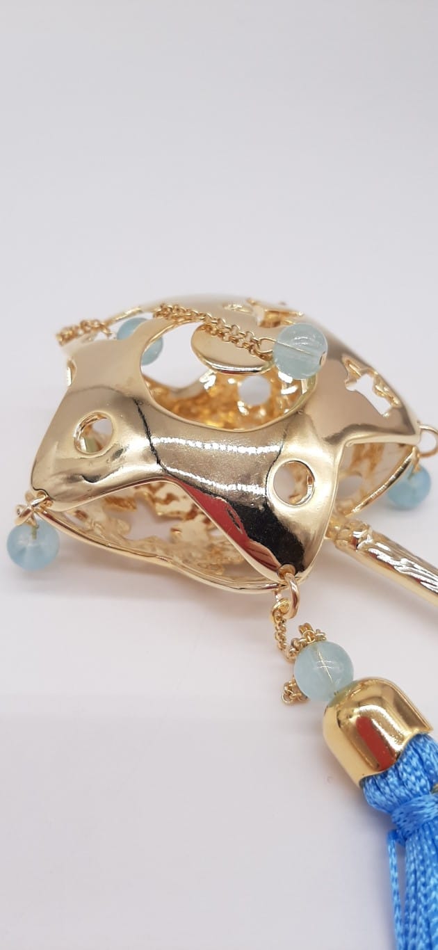 Μεταλλική κουδουνίστρα από λουστραρισμένο μπρούτζο, για να μην αλλοιώνεται στο χρόνο. Συνοδεύεται από μεταλλική αλυσίδα με μάτι από σμάλτο και μεταξωτή φούντα.