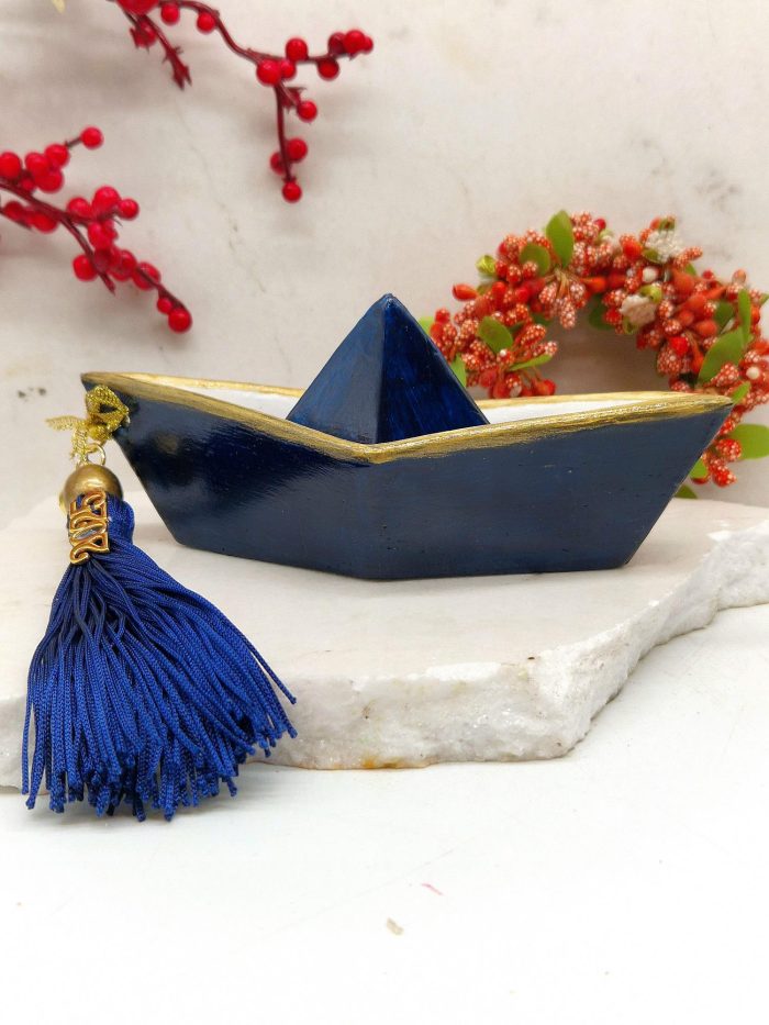 Καράβι από πορσελάνη, σε σχήμα χάρτινου καραβιού, σε τρία μεγέθη και σε χρώμα μπλε, διακοσμημένο με γυάλινες χάντρες και λευκές φούντες. Ιδανικό δώρο για να ευχηθείτε για ένα ήρεμο ταξίδι στη ζωή, καλοτυχία, και ηρεμία στο σπιτικό των φίλων, συνάδελφων και πελατών για τη νέα χρονιά.
