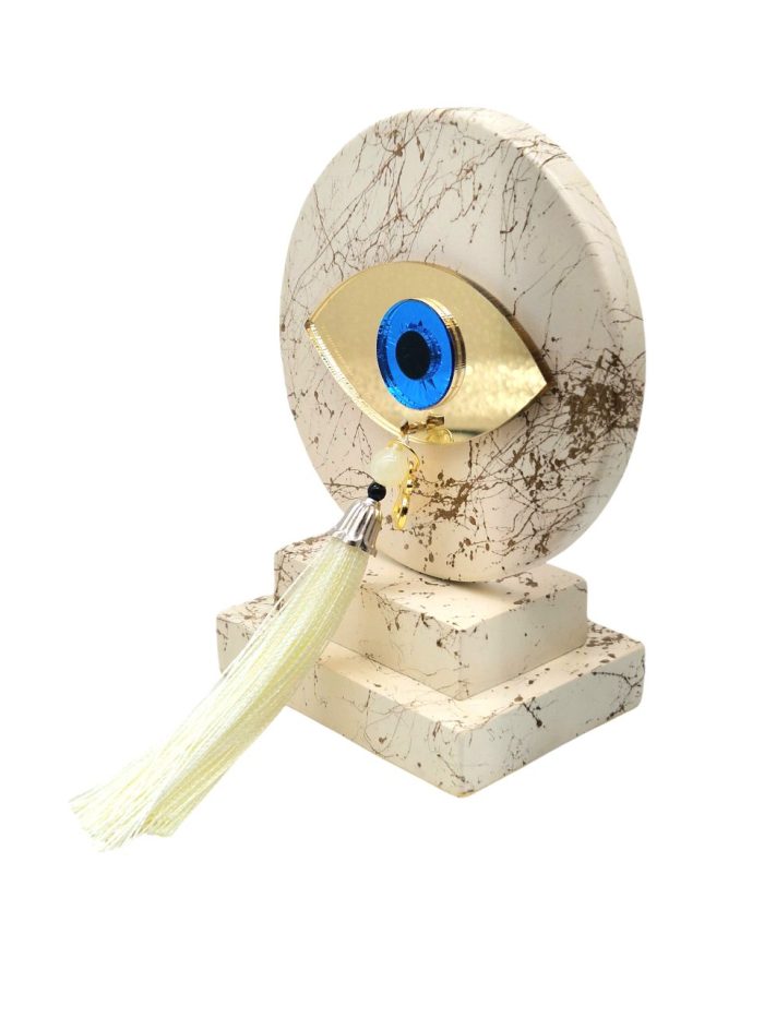 Μάτι από plexiglass πάνω σε πορσελάνινη επιφάνεια, τοποθετημένα πιάνω σε βάση από πορσελάνη επίσης. Οι επιφάνειες είναι ζωγραφισμένες με τρόπο ώστε να δείχνουν σαν γρανίτης.