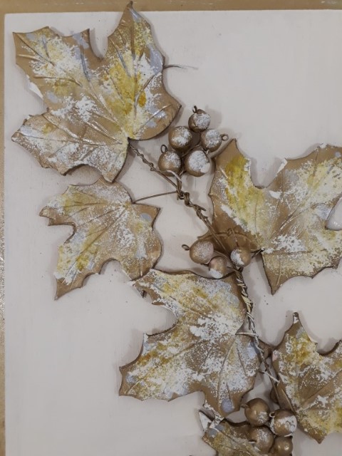 Χειροποίητος πίνακας από τριπλό ταμπλό ξύλου με χρώματα εκρού – καφέ – χρυσό σε πατίνα, με μοτίβο κεραμική άμπελο.