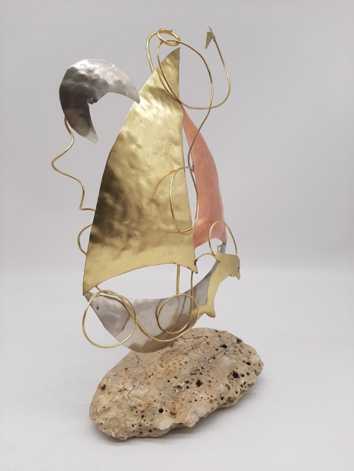 Μεταλλική σύνθεση με καράβι,  δελφίνι, γλάρο και φεγγάρι από φύλλα ορείχαλκου, χαλκού και αλπακά. Τα μέταλλα είναι δεμένα μεταξύ τους με ορειχάλκινο σύρμα.