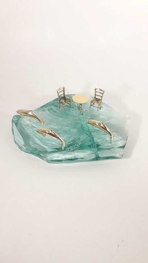 Δελφίνια και καφενείο από μπρούντζο επικαλυμμένα με ειδικό βερνίκι για να μην χάνουν ποτέ τη λάμψη και το χρώμα τους, πάνω σε διάφανο πράσινο γυαλί.