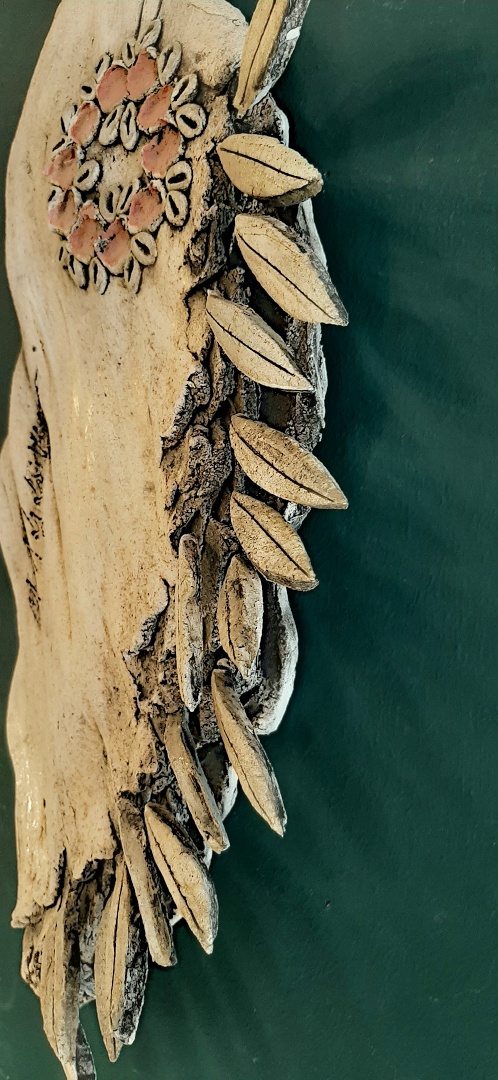 Χειροποίητη, κεραμική φιγούρα, που αναπαριστά γυναίκα με τρισδιάστατα φύλλα ελιάς στο φόρεμά της. Δημιουργία της Μαρίας Λαλαούνη από πηλό stonewear και ανάγλυφα χαρακτικά χρωματισμένα με πυροχρώματα και μπατανάδες, εφαρμοσμένα με έναν ιδιότυπο, προσωπικό τρόπο ώστε να εξυπηρετήσει τις χαράξεις και τα ανάγλυφα μέρη των κεραμικών της.