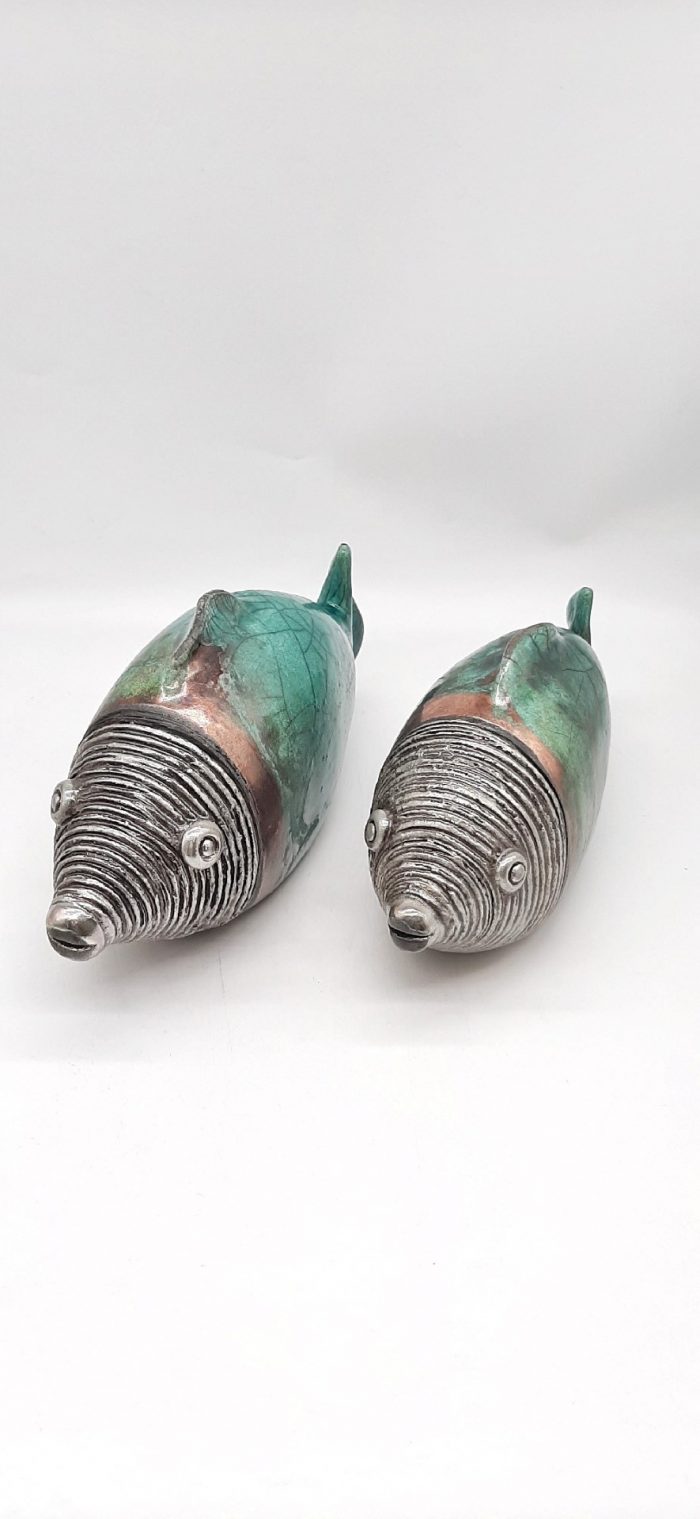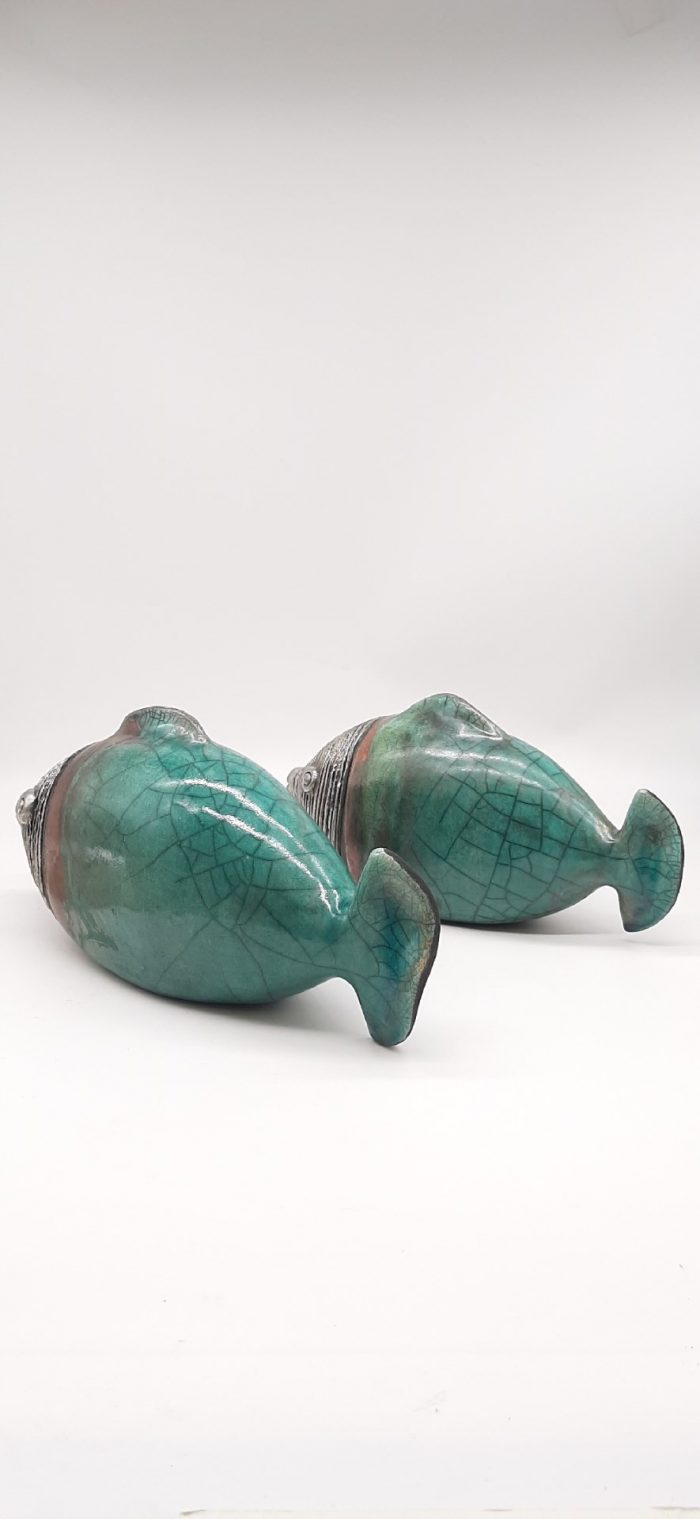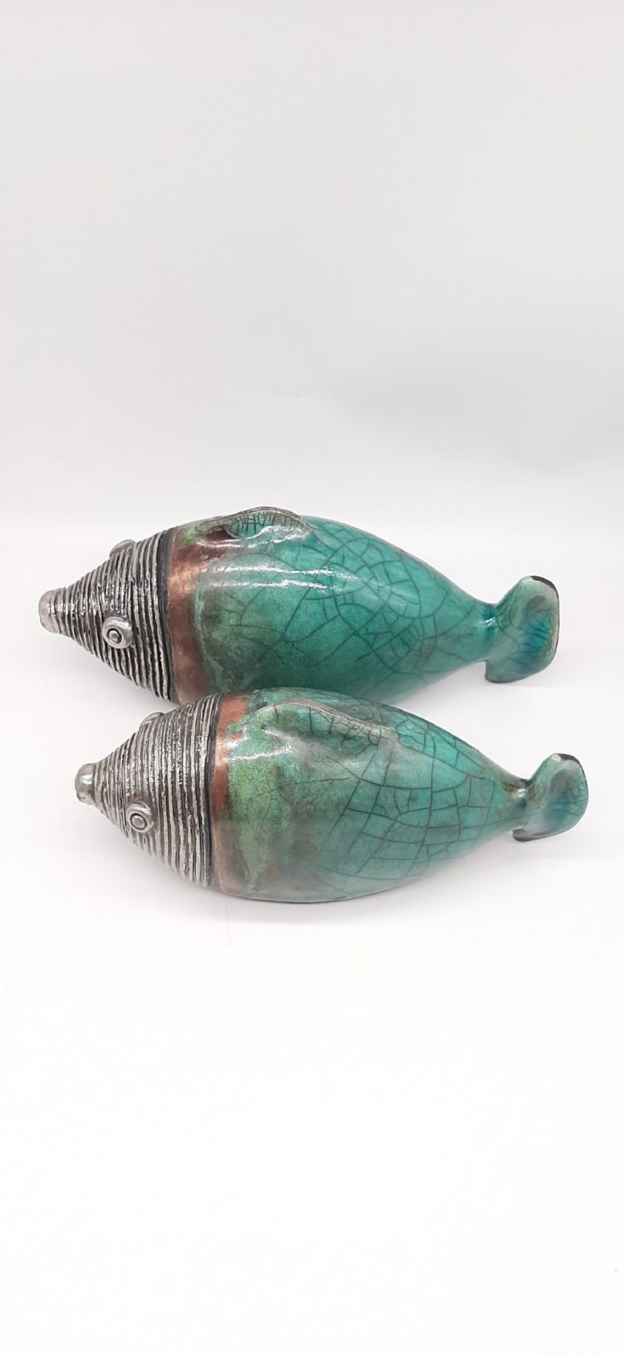 Χειροποίητα, κεραμικά γλυπτά που αναπαριστούν ψάρια με ουρά σε τυρκουάζ χρώμα, ψημένα με την τεχνική raku σε καμίνι με ανοιχτή φωτιά στους 1000 βαθμούς Κελσίου. Η διακόσμηση γίνεται με γυαλώματα λευκά ή χρωματιστά, με οξείδια μετάλλων και νιτρικό άργυρο, χαρακτηριστικό της τεχνικής raku.