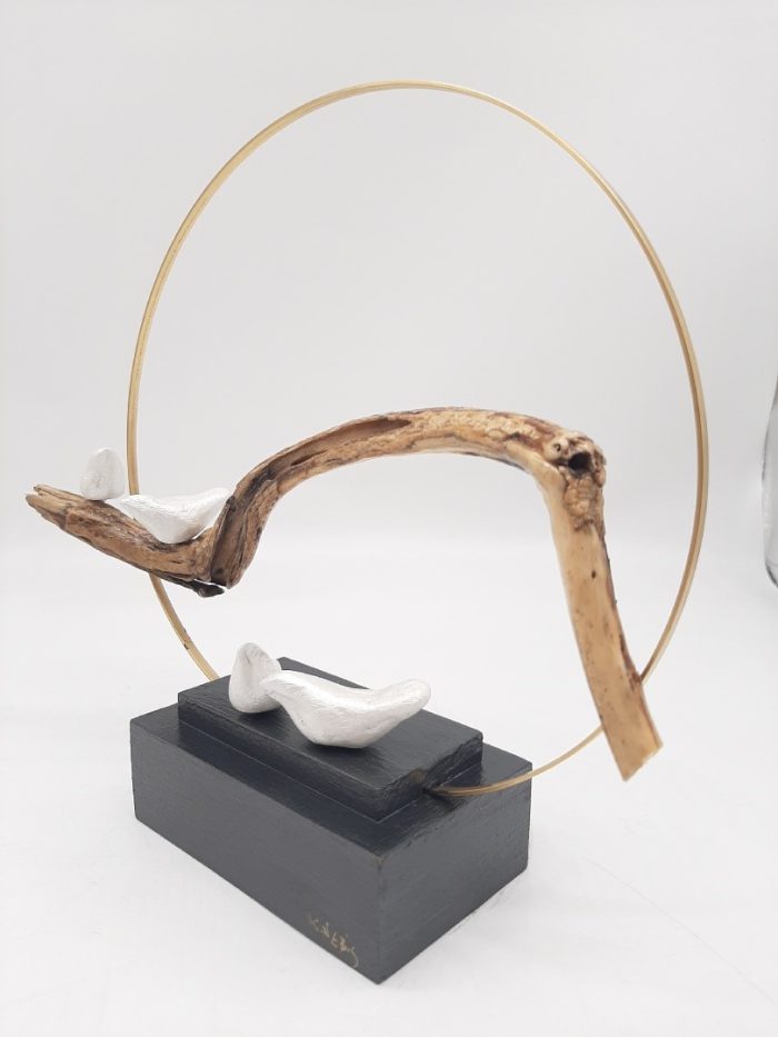 Κεραμικά πουλάκια στο χρώμα της πέρλας, θαλασσόξυλο, πλατύ σύρμα ορείχαλκου, πάνω σε ξύλινη βάση στο χρώμα του γραφίτη, συνθέτουν μια χειροποίητη δημιουργία του “ΝΕΜΠΗΣ ΤΕΧΝΗΣ ΟΙΚΟΣ”