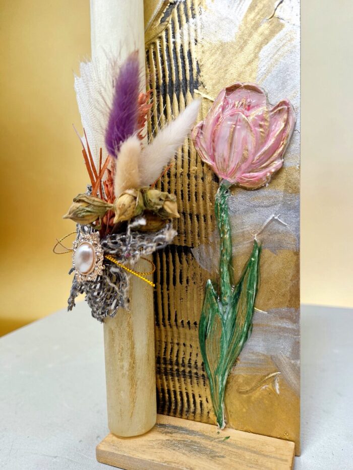 Συνοδεύεται από ξύλινο πινακάκι με κεραμική ζωγραφισμένη τουλίπα το οποίο σαν σύνθεση θα διακοσμήσουν όμορφα τον τοίχο κάθε δωματίου. Η λαμπάδα, αποσπάται εύκολα από τη σύνθεση για να χρησιμοποιηθεί.