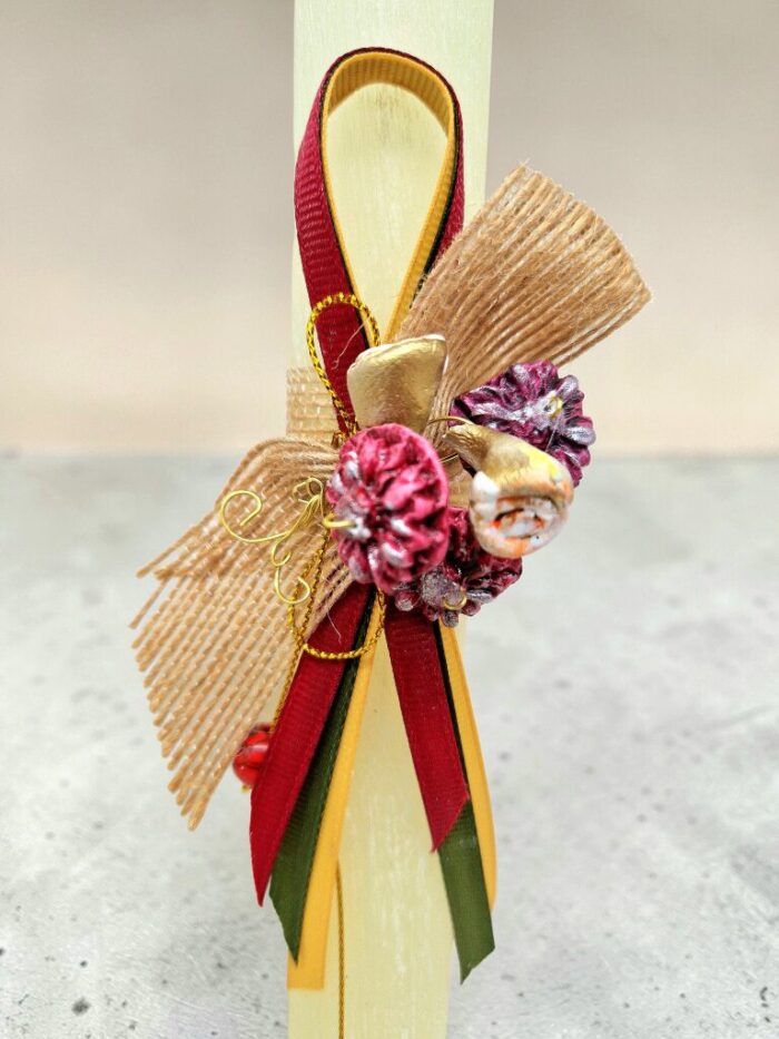 Αρωματική λαμπάδα οβάλ σε εκρού χρώμα, στολισμένη με κορδέλες και χειροποίητα κεραμικά λουλούδια.