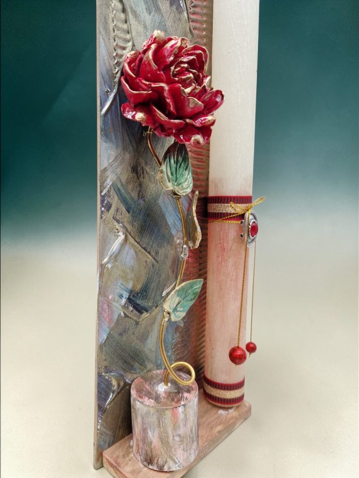 Συνοδεύεται από ξύλινο πινακάκι και πορσελάνινο τριαντάφυλλο ζωγραφισμένα στο χέρι, τα οποία σαν σύνθεση θα διακοσμήσουν όμορφα τον τοίχο καθε δωματίου. Η λαμπάδα αποσπάται εύκολα από τη σύνθεση για να χρησιμοποιηθεί.