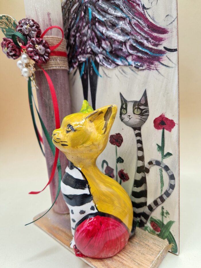 Συνοδεύεται από ξύλινο πινακάκι διακοσμημένο με την τεχνική decoupage, ζωγραφική και πορσελάνινη χειροποίητη γάτα, τα οποία σαν σύνθεση θα διακοσμήσουν όμορφα τον τοίχο κάθε δωματίου. Η λαμπάδα αποσπάται εύκολα από τη σύνθεση για να χρησιμοποιηθεί.