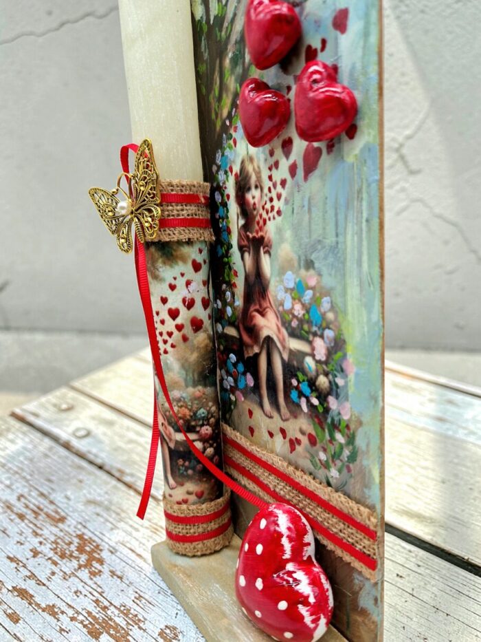 Συνοδεύεται από ξύλινο πινακάκι διακοσμημένο με την τεχνική decoupage, ζωγραφική στο χέρι και κόκκινες πορσελάνινες καρδιές, το οποίο σαν σύνθεση θα διακοσμήσει όμορφα τον τοίχο κάθε δωματίου. Η λαμπάδα αποσπάται εύκολα από τη σύνθεση για να χρησιμοποιηθεί.