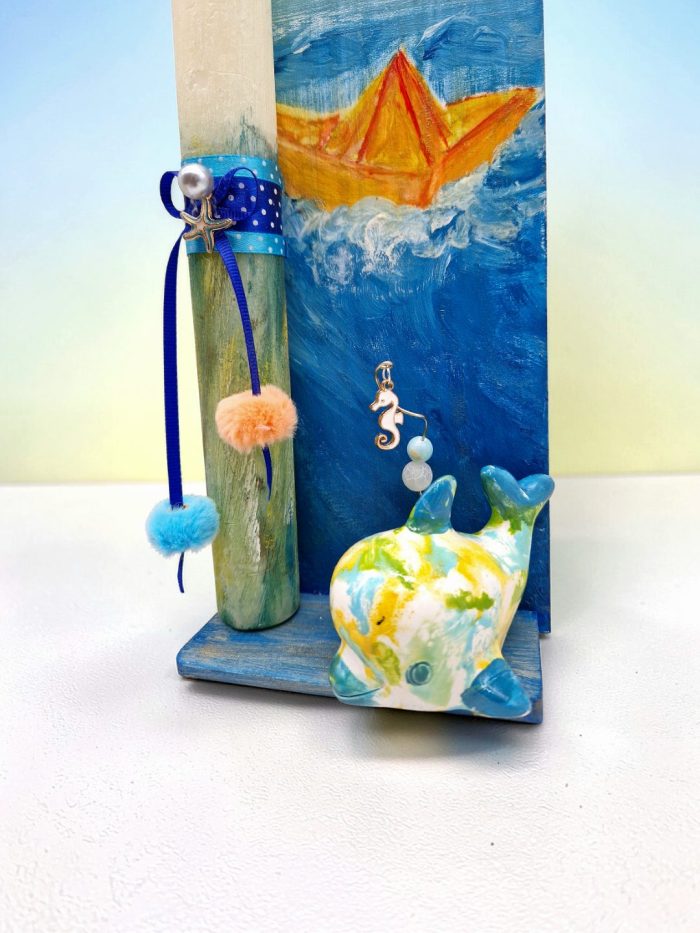 Συνοδεύεται από ξύλινο πινακάκι και πορσελάνινο δελφινάκι ζωγραφισμένα στο χέρι, τα οποία σαν σύνθεση θα διακοσμήσουν όμορφα τον τοίχο του παιδικού δωματίου. Η λαμπάδα αποσπάται εύκολα από τη σύνθεση για να χρησιμοποιηθεί.