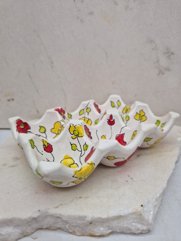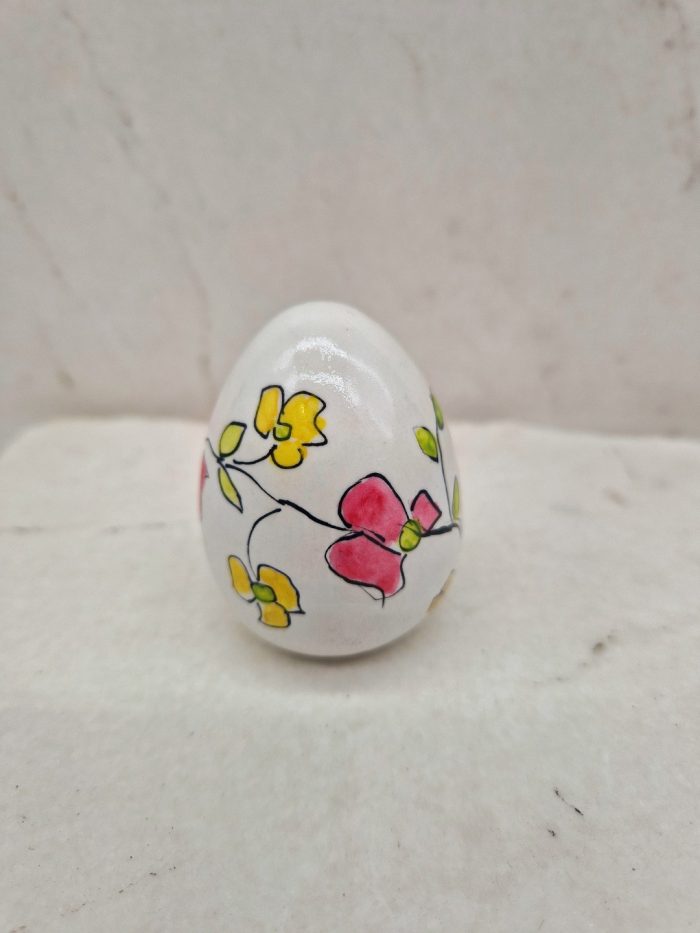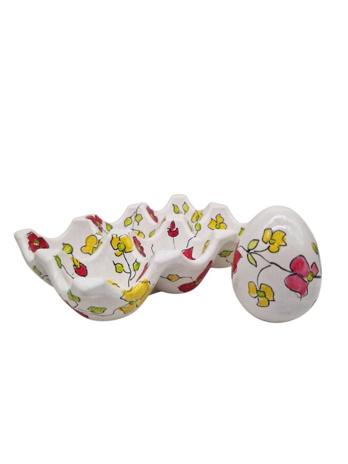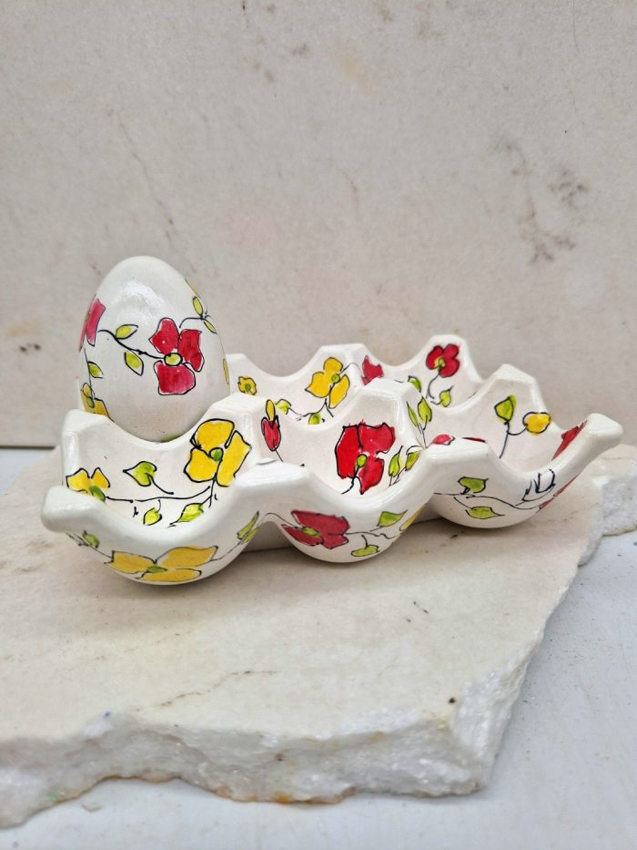 Πορσελάνινη αβγοθήκη ζωγραφισμένη στο χέρι με κίτρινα και κόκκινα λουλούδια και αβγό επίσης ζωγραφισμένο στο χέρι με παρόμοιες αποχρώσεις.
