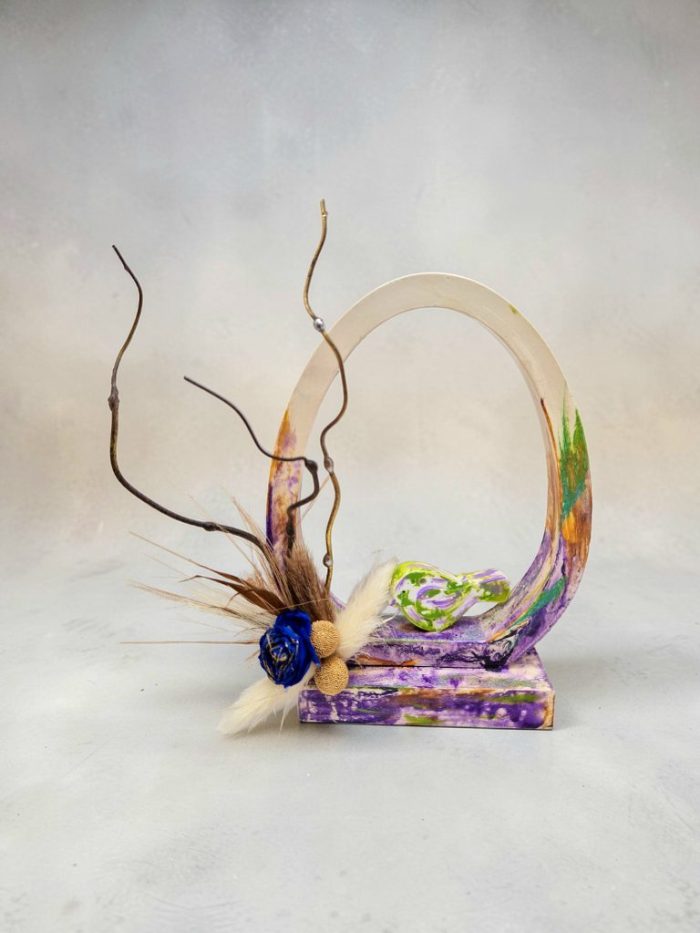 Πορσελάνινο διακοσμητικό σε οβάλ σχήμα πάνω σε βάση, ζωγραφισμένο στο χέρι με μωβ και κεραμιδί αποχρώσεις. Η σύνθεση είναι διακοσμημένη με διάφορα αποξηραμένα και συνθετικά λουλούδια και χειροποίητα, μεταλλικά ορειχάλκινα κλαδιά με παλαίωση.