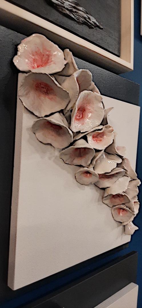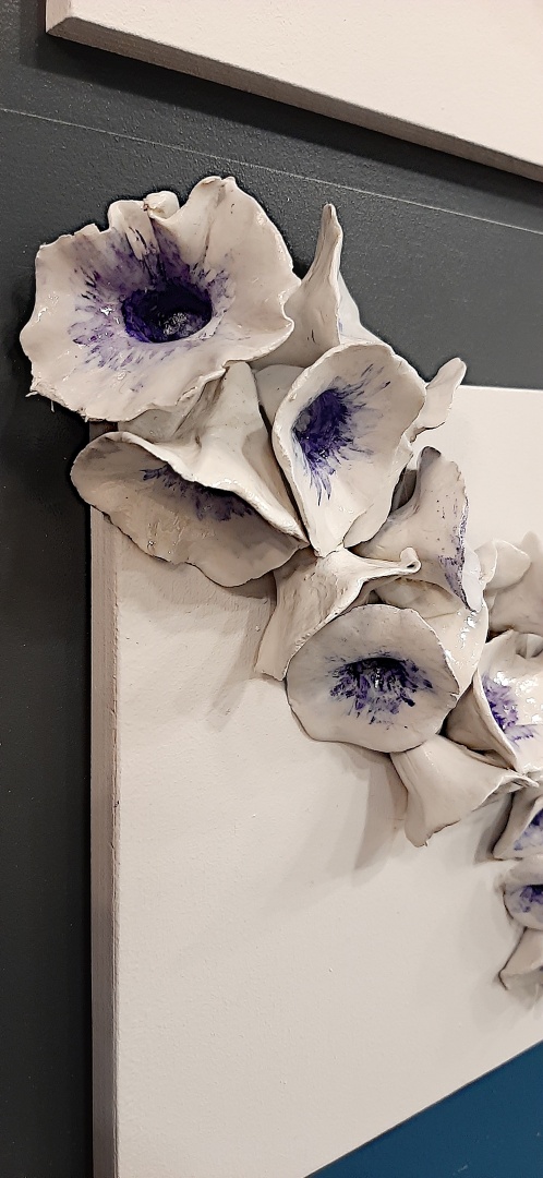Επιτοίχιος πίνακες που αποταιλείται από διπλό ξύλινο ταμπλό σε χρώματα λευκού και μαύρου και τρισδιάστατα λευκά κεραμικά λουλούδια με πατίνα χρώματος μωβ ή σομόν.