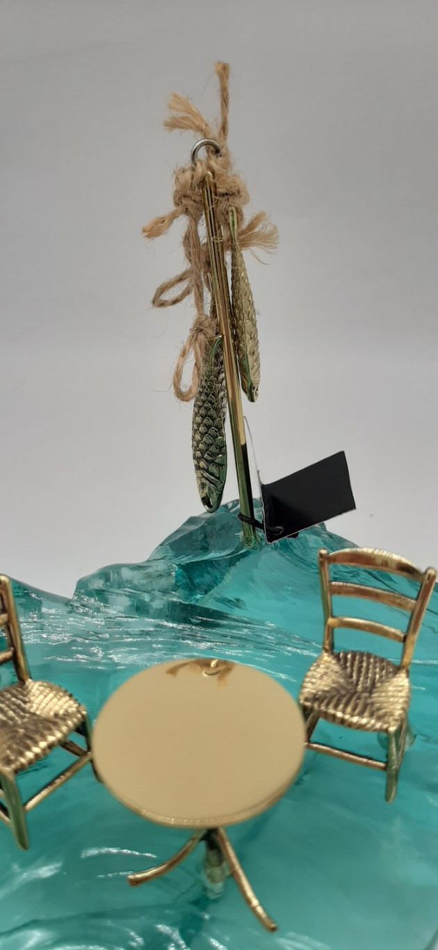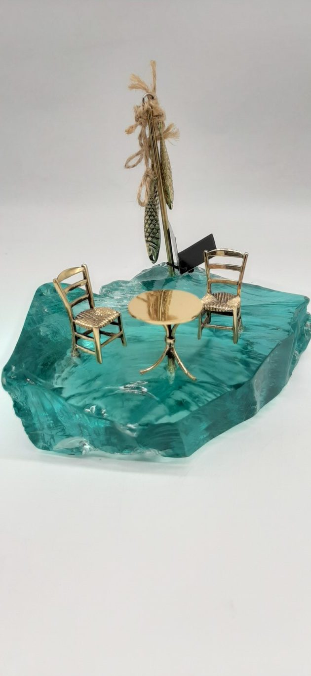 Καφενείο και ψάρια από μπρούτζο, επικαλυμμένα με ειδικό βερνίκι για να μη χάσουν ποτέ τη λάμψη και το χρώμα τους, πάνω σε διάφανο πράσινο γυαλί. Χειροποίητη, ελληνική δημιουργία της Νάσιας Τζουμάκα.