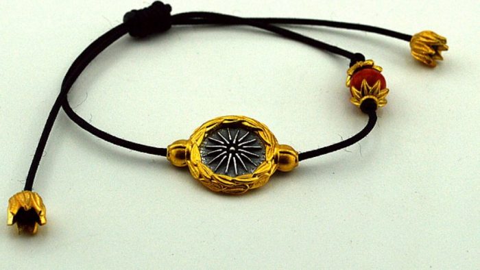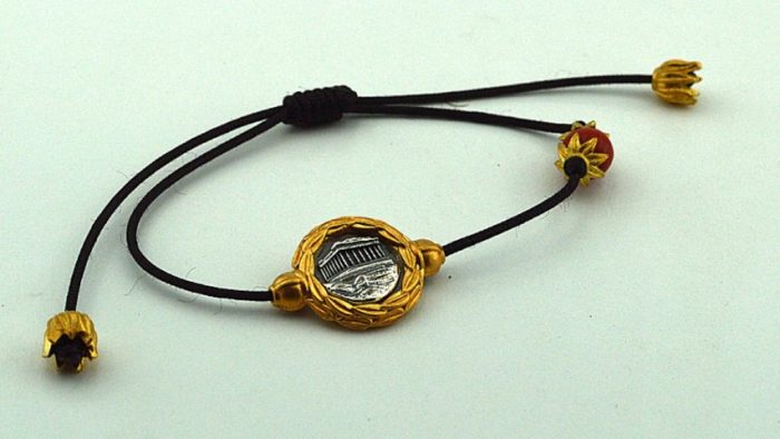Βραχιόλι από ασήμι 925 σε πέντε διάφορετικά σχέδια- μοτίβα, επίχρυσο στεφάνι ελιάς (κότινος) γύρω, κοράλλι και μαύρο κορδόνι .