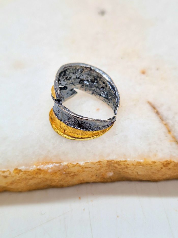 Χειροποίητο δαχτυλίδι με μοτίβο από δίχρωμα φύλλα ελιάς σε επίχρυσο ασήμι και μαύρη επιροδίωση, που αγκαλιάζουν απαλά το δάχτυλο.